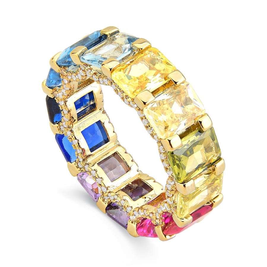 Design de aliança com pedras e zircônias coloridas que destacam o visual.