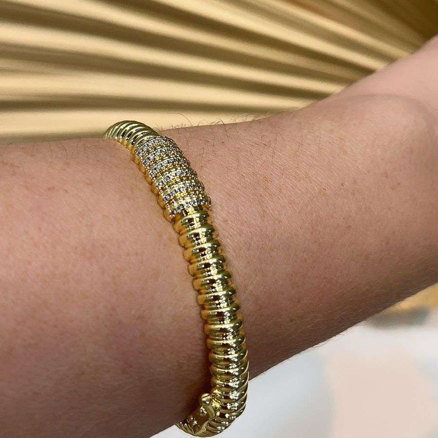 O bracelete com detalhe cravejado banhado a ouro 18k é uma peça que une a delicadeza do design cravejado com o brilho intenso do ouro, criando um visual sofisticado e elegante. A atenção aos detalhes faz com que esta joia se destaque em qualquer ocasião.Com 6 cm de diâmetro, o bracelete proporciona um ajuste perfeito ao pulso, oferecendo tanto conforto quanto estilo. Seu tamanho é ideal para quem busca uma peça discreta, mas que ainda assim chame a atenção.