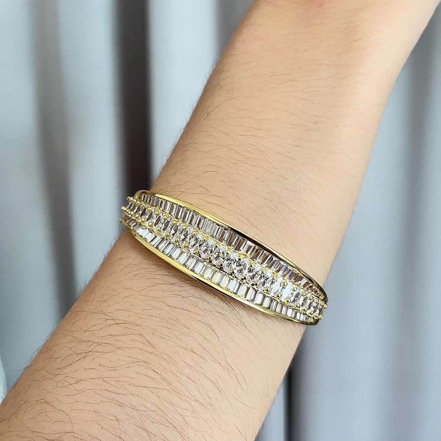 Este bracelete cravejado banhado a ouro 18k é uma peça luxuosa que combina a elegância do ouro com o brilho das pedras cravejadas. Seu design refinado e sofisticado é perfeito para adicionar um toque de glamour ao seu visual, seja para eventos especiais ou para o uso diário.Com 6,5 cm de diâmetro, o bracelete foi pensado para se ajustar de maneira confortável ao pulso, proporcionando um encaixe perfeito que realça ainda mais sua beleza. O tamanho é ideal para quem busca um acessório que chame atenção sem perder a sofisticação.