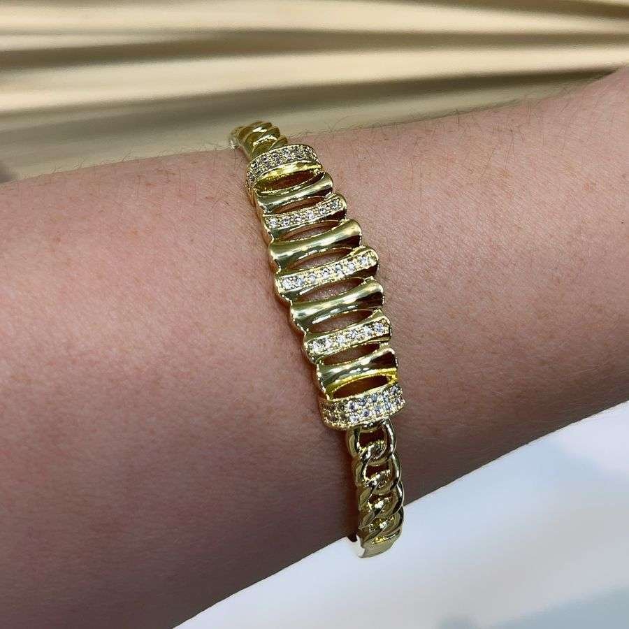 O bracelete cravejado banhado a ouro 18k é a peça perfeita para quem deseja um toque de sofisticação no visual. Com pedras cravejadas que capturam a luz de maneira única, ele traz brilho e elegância em cada detalhe.Com 6 cm de diâmetro, este bracelete se adapta perfeitamente ao pulso, oferecendo um ajuste confortável e discreto. Seu design permite que seja usado em diversas ocasiões, seja para complementar um look do dia a dia ou para eventos mais especiais.