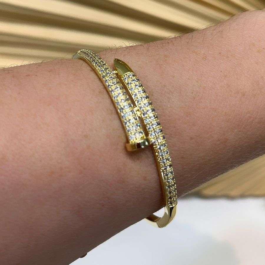 Este bracelete com prego de zircônia cristal banhado a ouro 18k é uma peça deslumbrante que une elegância e brilho, ideal para quem busca um acessório que chama atenção com sofisticação.Com 6 cm de diâmetro, o bracelete oferece um ajuste confortável e perfeito para diversos tamanhos de pulso, destacando-se sem abrir mão do conforto.