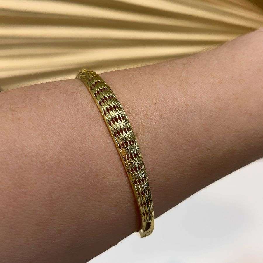 O bracelete trabalhado banhado a ouro 18k é uma peça que exibe sofisticação e requinte, com detalhes intricados que capturam a luz de forma única. Seu design especial transforma o acessório em uma obra de arte que complementa qualquer look com classe.Com 6 cm de diâmetro, ele se ajusta com perfeição ao pulso, proporcionando conforto ao mesmo tempo em que exibe seu charme exclusivo. A combinação entre o tamanho e o trabalho artesanal dá um toque de elegância refinada.