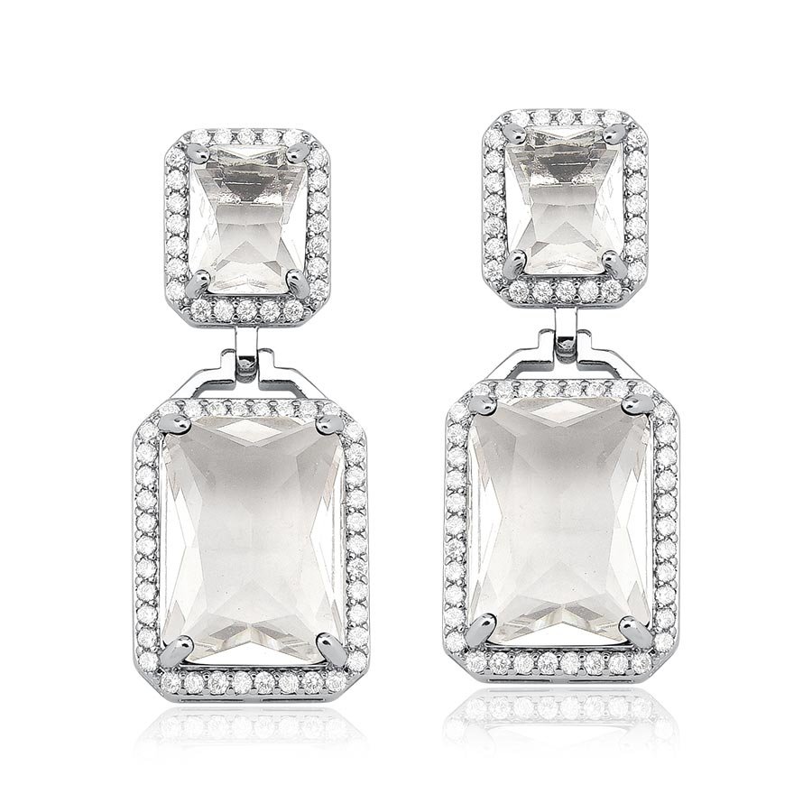 Brinco cravejado com pedra cristal banhado a ouro branco, perfeito para revendedoras que desejam oferecer luxo e brilho em cada detalhe.Com 3,5 cm, é uma peça marcante e sofisticada que encanta pela elegância e pela luminosidade das pedras.