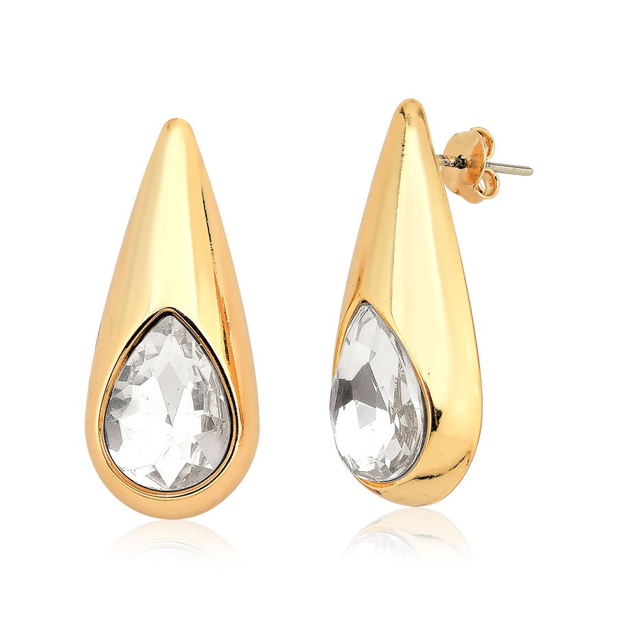 O brinco em formato de gota com pedra cristal e banho dourado é a definição de elegância clássica com um toque de brilho refinado. Seu design alongado valoriza o rosto e adiciona sofisticação imediata a qualquer visual.Com 3 cm de comprimento, ele se destaca com leveza, sendo ideal para ocasiões especiais ou para transformar um look básico em algo marcante.