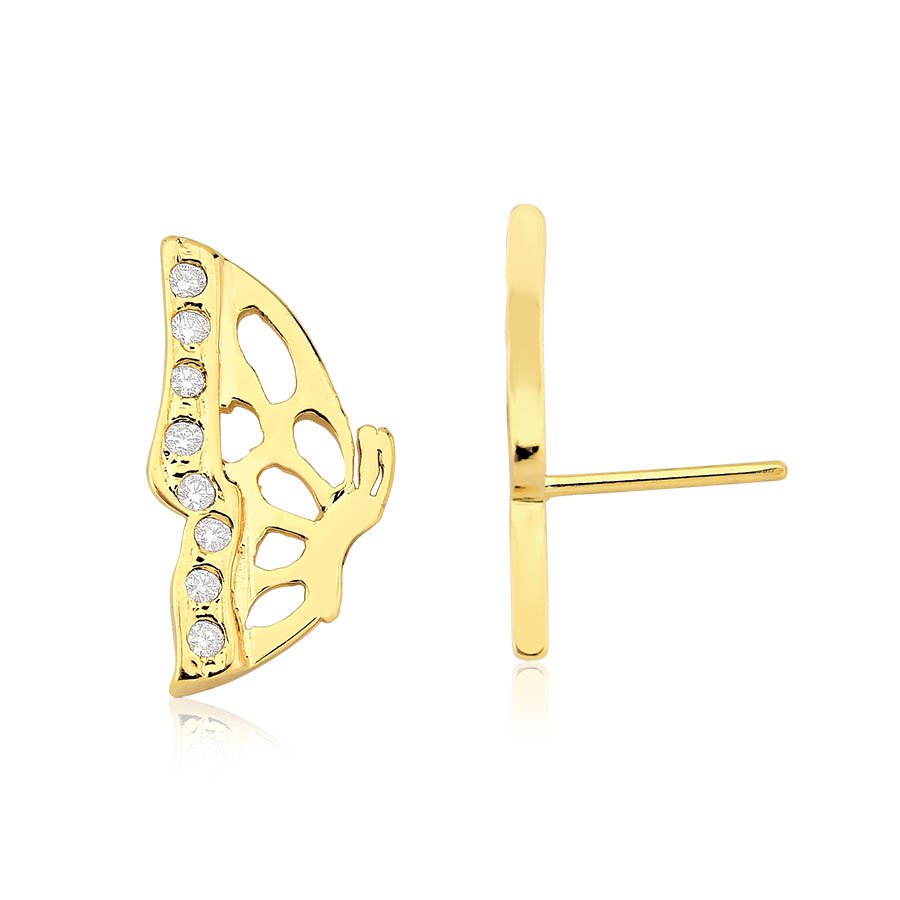 Encante-se com a delicadeza única do brinco meia borboleta, adornado com deslumbrante zircônia e banhado em ouro 18k. Esta peça é uma verdadeira expressão de beleza natural, capturando a graça e a leveza das borboletas em um design encantador e refinado.Com um tamanho gracioso de 1,5cm, este brinco é uma afirmação de estilo em proporções delicadas. Sua presença sutil e seu brilho delicado tornam-no perfeito para adicionar um toque de elegância a qualquer look, seja para ocasiões especiais ou para o dia a dia.