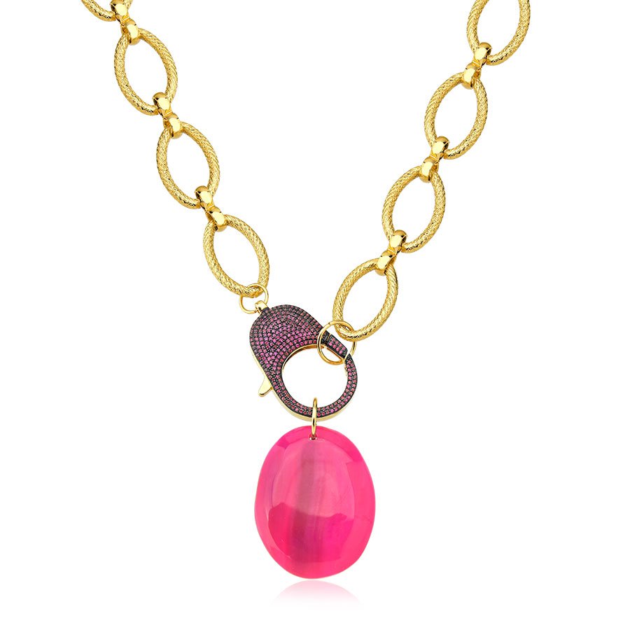Destaque-se com o Colar dourado oval pedra natural ágata pink, uma peça encantadora que irradia elegância e estilo. Este colar apresenta um pingente oval de ágata pink, delicadamente cravejado com detalhes que adicionam um toque de brilho e sofisticação ao seu visual. A tonalidade vibrante da ágata pink é um convite para expressar sua feminilidade e sua personalidade única com confiança.A ágata pink é conhecida por suas propriedades de cura emocional, promovendo o amor próprio, a compaixão e a harmonia interior. Ao usar este colar, você pode se sentir envolvida por uma aura de amor e gentileza, permitindo que sua verdadeira beleza interior brilhe.