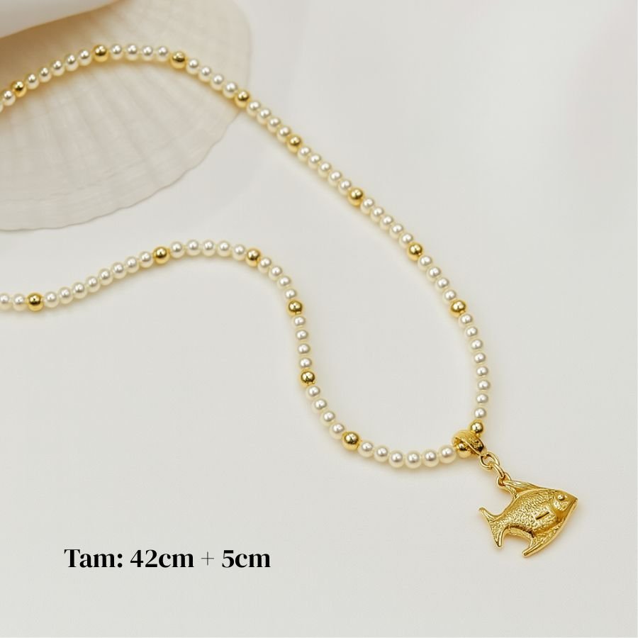 A gargantilha com pérolas 4mm e pingente de peixe banhado a ouro 18K é a peça perfeita para revendedoras que buscam delicadeza, significado e alta aceitação nas vendas.Seu design feminino e versátil encanta clientes de todas as idades, trazendo aquele toque de elegância luminosa que valoriza qualquer look. O pingente de peixe simboliza proteção e leveza, aumentando o desejo de compra.