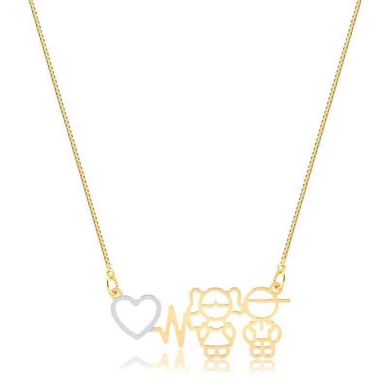Essa Gargantilha com um casal de filhos e um coração, folheada à ouro 18k e aplicação de Ródio branco no coração está um arraso!Acessório perfeito para levar sempre junto a lembrança de seus filhos!