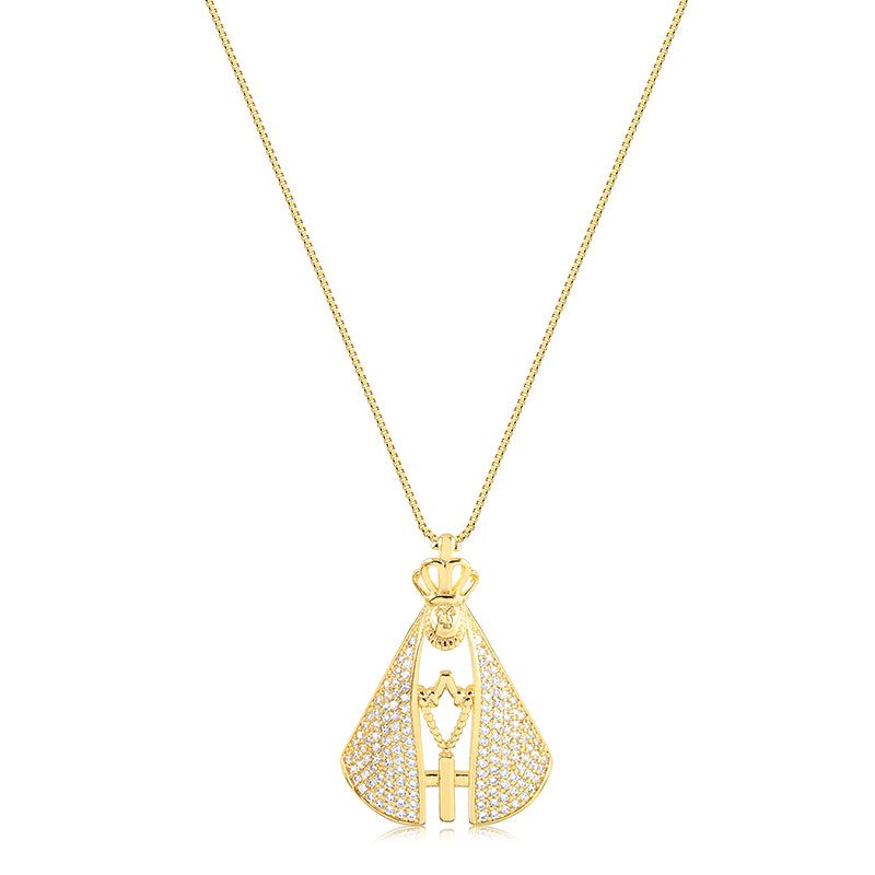 A Gargantilha Nossa Senhora Aparecida com Cristal Banhada a Ouro 18K é uma joia de fé e elegância, perfeita para revendedoras que desejam oferecer peças com propósito e alto valor emocional.Com 42cm + 5cm de extensor, ela se ajusta ao colo de forma delicada e sofisticada, unindo brilho, devoção e estilo.