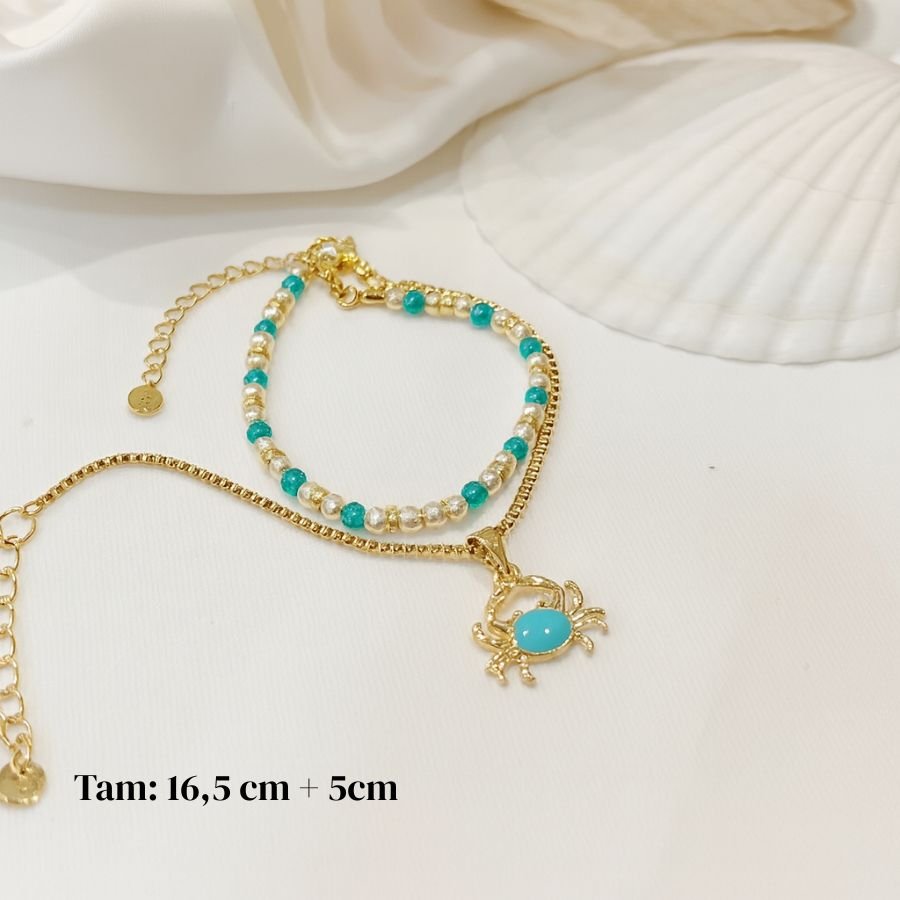 O kit com 2 pulseiras de cristais e mini pérolas com pingente de caranguejo banhado a ouro 18K é a combinação perfeita entre elegância e estilo praiano sofisticado.Com medidas de 16,5 + 17 + 5cm, esse conjunto traz o brilho delicado dos cristais, a suavidade das mini pérolas e o charme do pingente dourado em formato de caranguejo — símbolo de força e renovação.