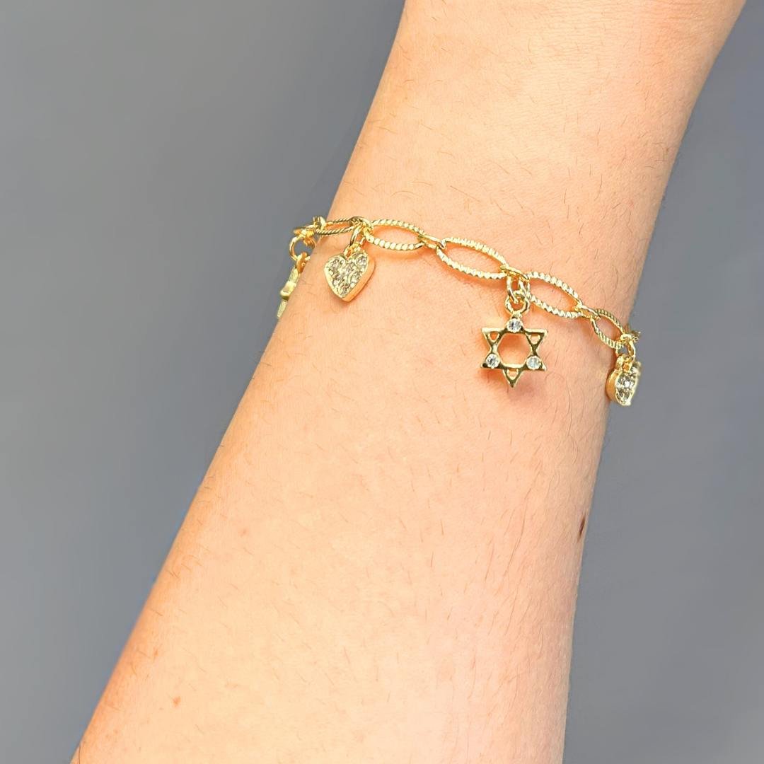 Além de sua beleza, a Pulseira com Pingentes Banhada a Ouro 18k oferece garantia de 1 ano, assegurando a confiança e a qualidade da peça. A assistência permanente também está à disposição, garantindo que, caso necessário, ajustes ou reparos sejam realizados com a máxima atenção e eficiência.
