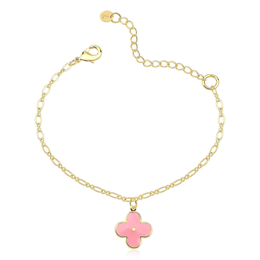 Celebre a delicadeza com a pulseira de trevo rosa banhada a ouro 18k, uma joia que traz um toque suave e feminino ao seu estilo. Com 16,5 cm de comprimento e um extensor de 5 cm, esta pulseira se ajusta perfeitamente ao seu pulso, destacando-se pelo encantador detalhe em trevo rosa.Conforto e segurança são prioridades nesta pulseira, que é hipoalergênica e adequada para todos os tipos de pele. Aproveite a tranquilidade de uma garantia de 1 ano e a assistência permanente, garantindo a durabilidade e a beleza da sua joia.