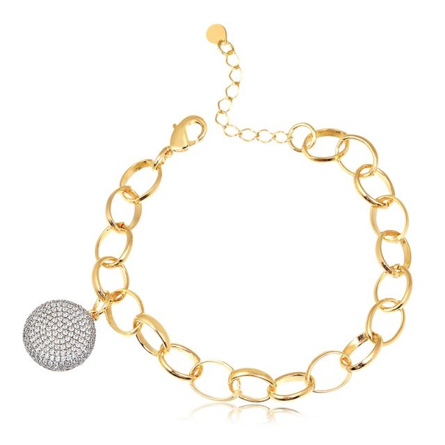 A pulseira de elos com esfera de zircônia, banhada a ouro 18k, é uma peça que combina estilo e sofisticação de forma única. Com elos delicadamente trabalhados e uma esfera de zircônia brilhante como destaque, esta pulseira adiciona um toque de elegância a qualquer look.Com 16,5 cm de comprimento, mais 5 cm de extensor e 1,5 cm de pingente, esta pulseira oferece um ajuste personalizável que se adapta perfeitamente ao pulso de quem a usa. Sua versatilidade permite que seja usada sozinha para um visual mais discreto ou combinada com outras peças para criar um estilo único e marcante.
